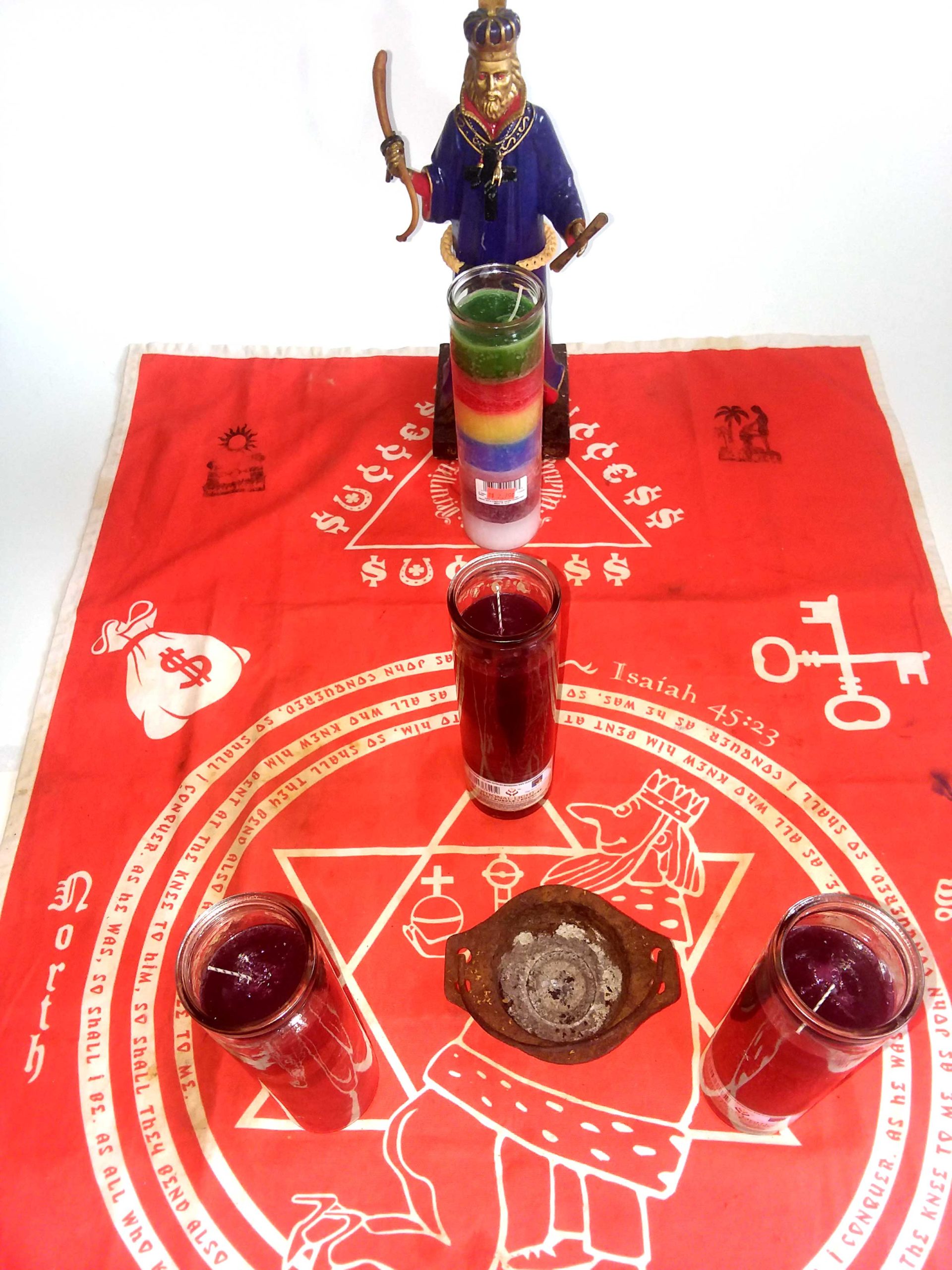 I put three purple candles in three of the corners of the Star of David at the bottom and a striped 7 color candle in the triangle up top, along with my High John loaded statue.