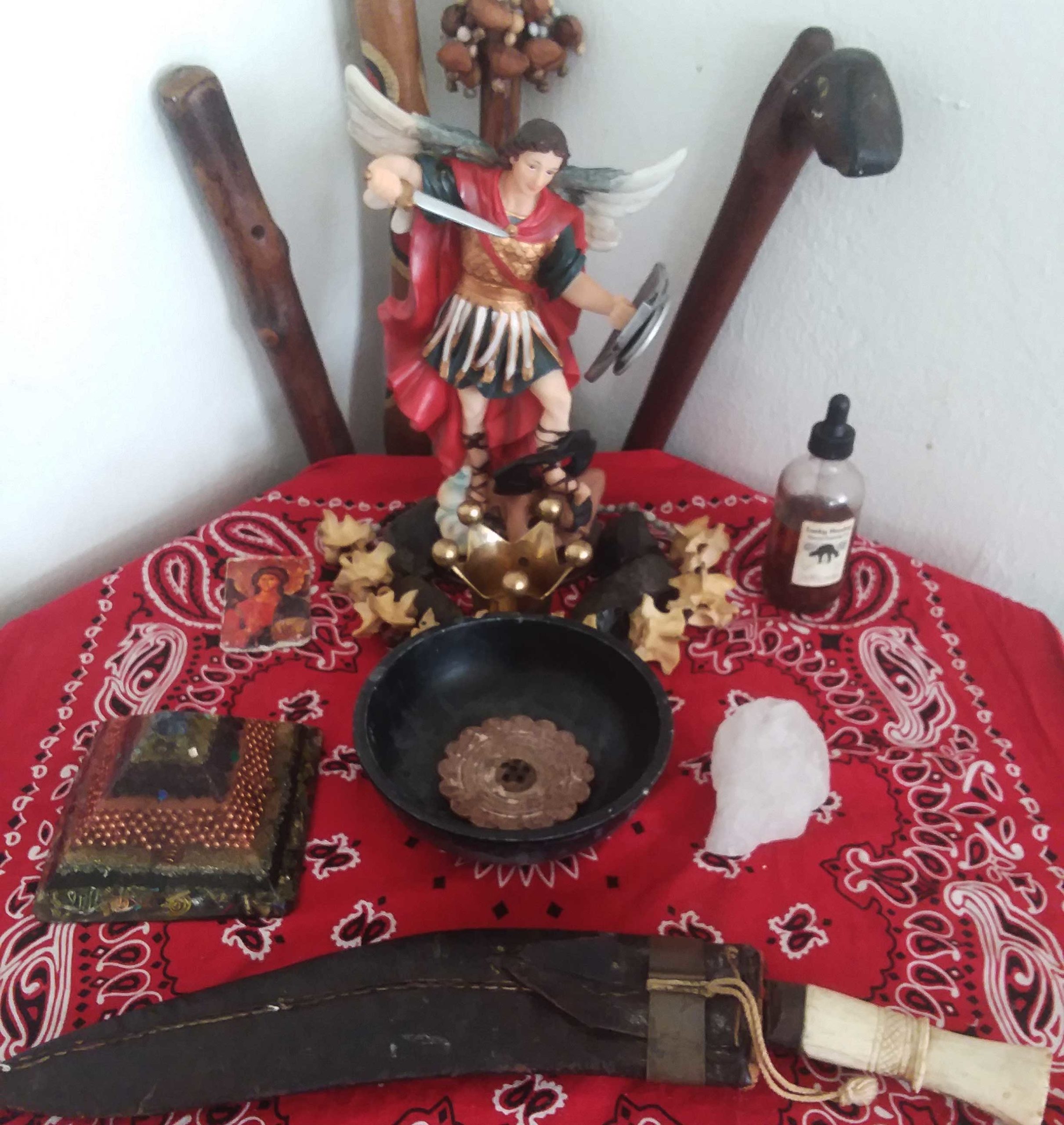 As a practical matter, St. Michael gets red candles with “Fiery Wall of Protection” oil on a regular basis, along with lavender incense and the well known prayer from Pope Leo XII :