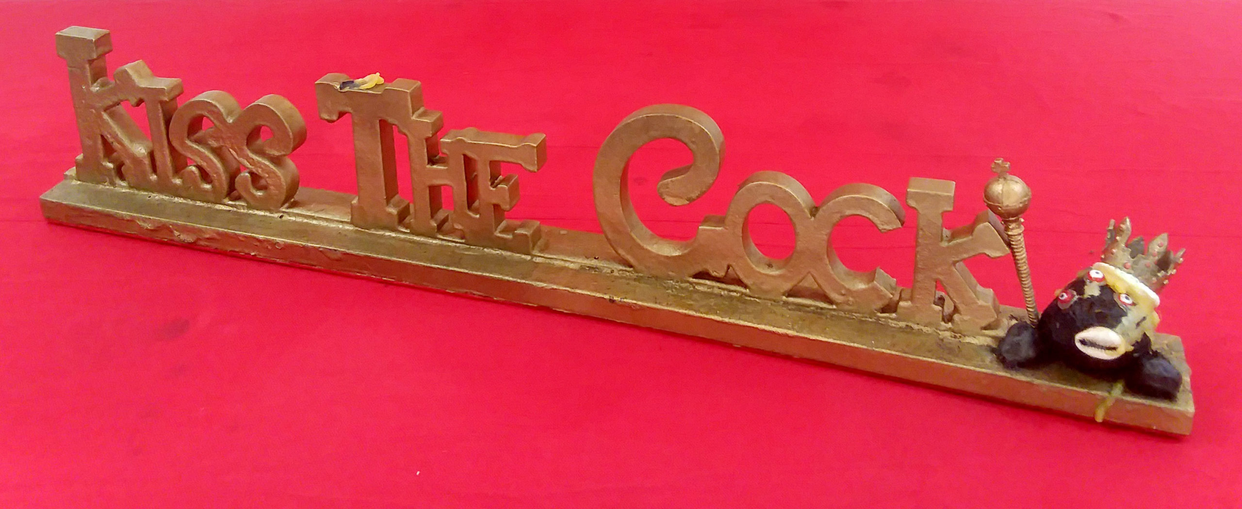 I got a folky kitchen sign from Cracker Barrel made out of carved wood that said “Kiss The Cook” in cut-out wooden letters. I sawed off part of the last “o” so that it now read “Kiss the Cock” instead, removed the resin rooster, and replaced it with a John the Conqueror root and two lodestones. I attached some personal concerns to him with beeswax and gave him a crown from a Veggie Tales action figure that I filled with cubeb and damiana. He also got three red Turkish “Evil Eye” beads as eyes.