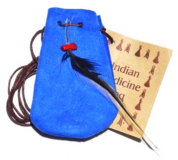 Classic native american medicine bag.A personal medicine bag is a traditional north american indian vessel containing various items that its owner believed held supernatural power or objects that symbolize personal well-being and tribal identity.Soft leather and measuring 3″x2″ at its widest points, with a cord of just under 18″s.Adorned with a feather and stone.