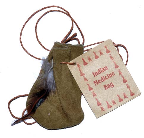 Classic native american medicine bag.A personal medicine bag is a traditional north american indian vessel containing various items that its owner believed held supernatural power or objects that symbolize personal well-being and tribal identity.Soft leather and measuring 3″x2″ at its widest points, with a cord of just under 18″s.Adorned with a feather and stone.