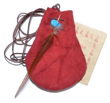Classic native american medicine bag.A personal medicine bag is a traditional north american indian vessel containing various items that its owner believed held supernatural power or objects that symbolize personal well-being and tribal identity.Soft leather and measuring 3″x2″ at its widest points, with a cord of just under 18″s.Adorned with a feather and stone.