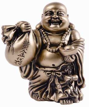 A small buddha statue adorned with and carrying symbols of wealth and prosperity.Perfect for any altar or shrine space dedicated to spiritual or material prosperity.Cold cast resin.3 3/4″ x 2 3/4″ x 2″