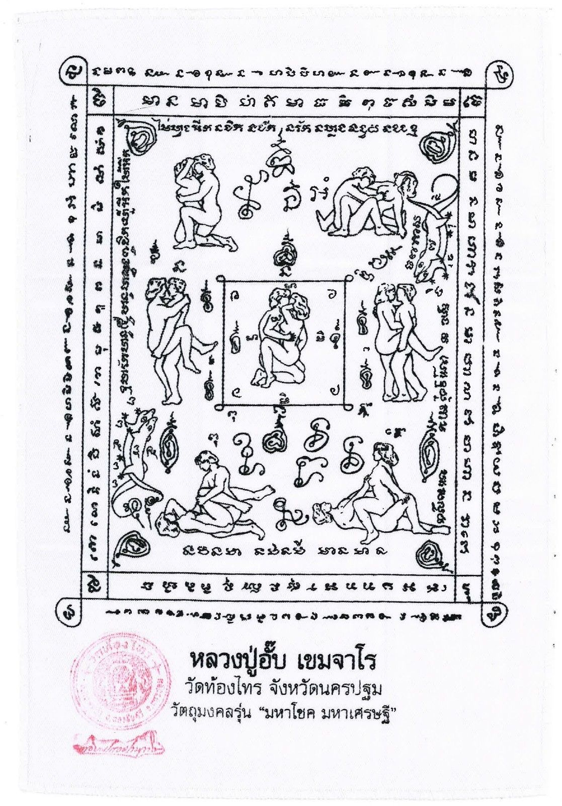 A large (approx legal sized) temple blessed magic cloth from Thailand’s tradition of magical Buddhism.This cloth depicts symbols of Mae Nang Phim, a benevolent mountain deva who assists with issues of love, protection and healing.