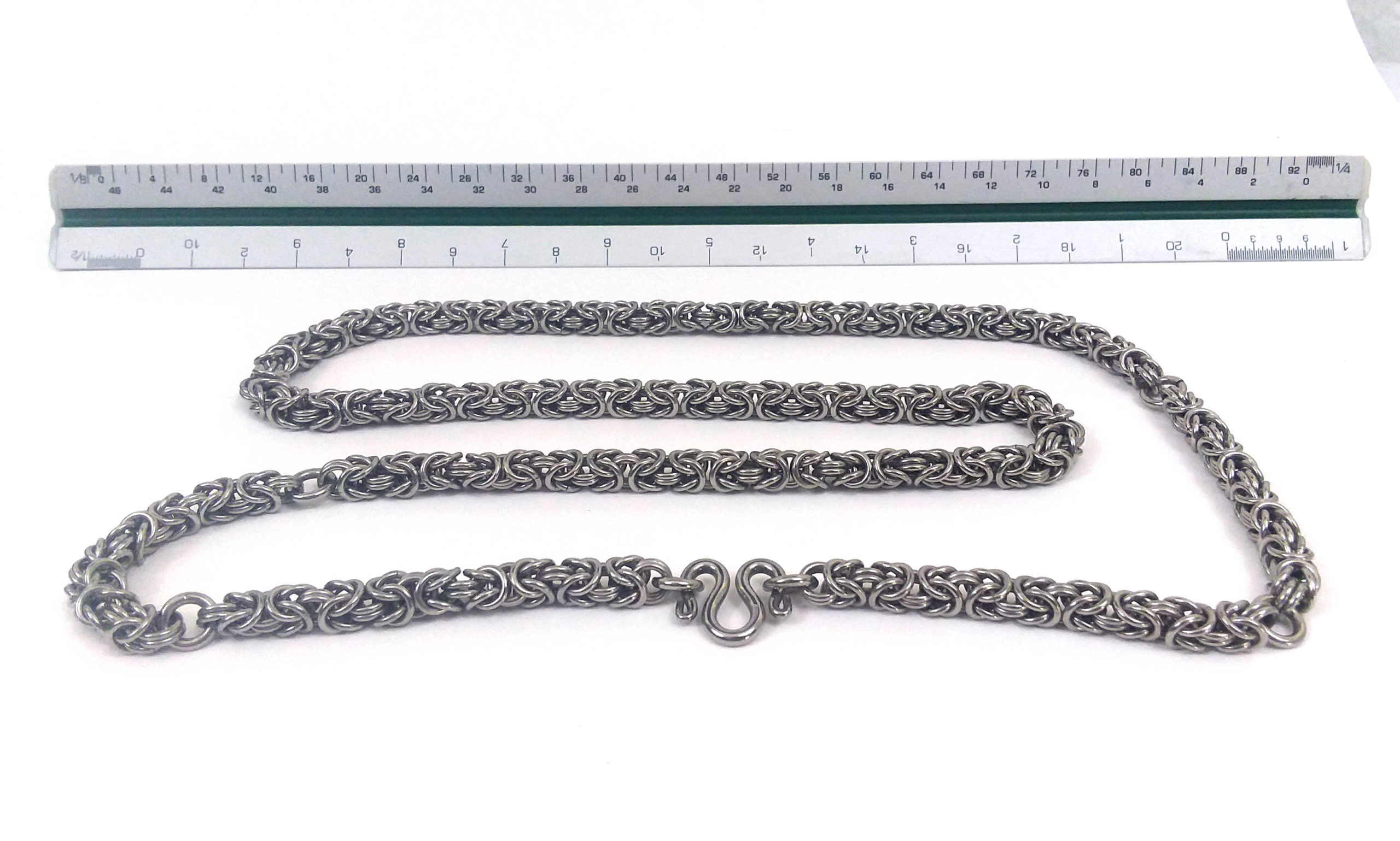 30″ long, stainless steel, very dense, thick & heavy interlocking chainmail weave, hooks for 5 amulets